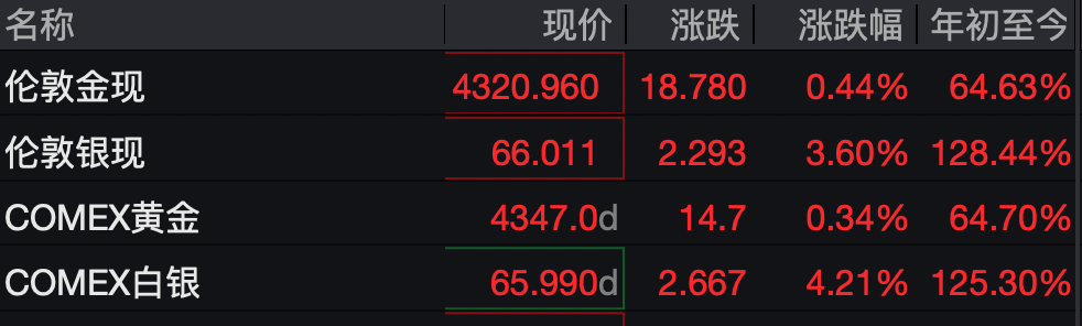 12月17日,白银市场迎来历史性时刻。 现货白银价格接连突破65美元/盎司和66美元/盎司两道关口,再创历史新高,截至发稿报66.01美元/盎司,涨3.6%。COMEX白银期货一度大涨超5%,峰值最高达66.5美元/盎司,截至发稿报65.99美元/盎司,涨4.21%。